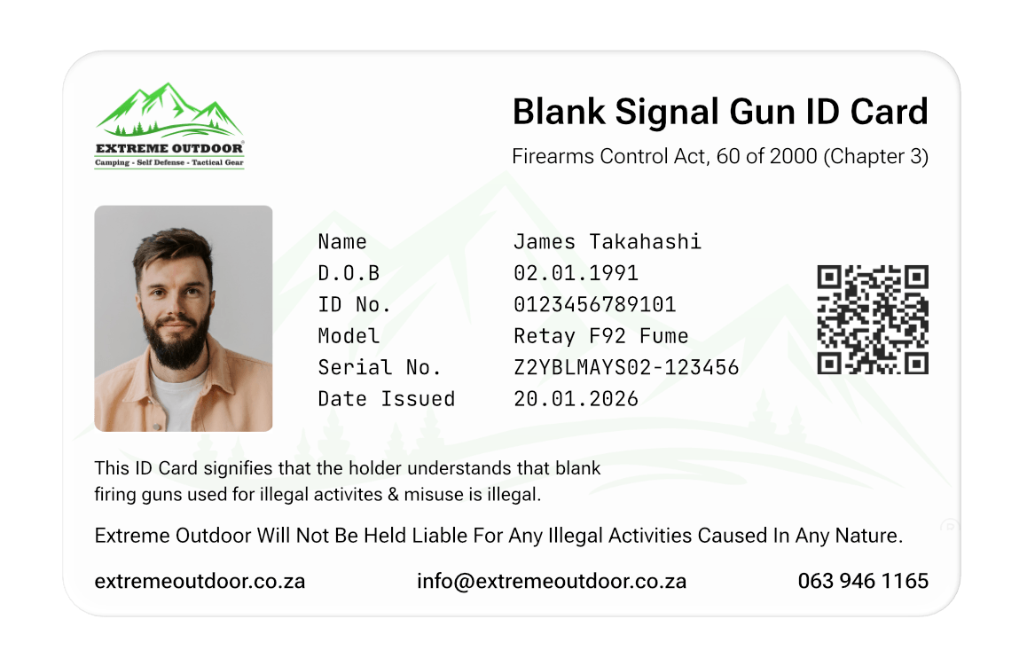 Keep your blank signal gun’s important details with you at all times. This ID card clearly displays your personal information with the specific model and serial number of your device, linking you directly to your blank gun. It references Chapter 3 of the Firearms Control Act to be used as a verified statement that you understand the laws regarding the illegal use and misuse of blank firing guns. It’s a physical record that shows your accountability and responsible ownership.