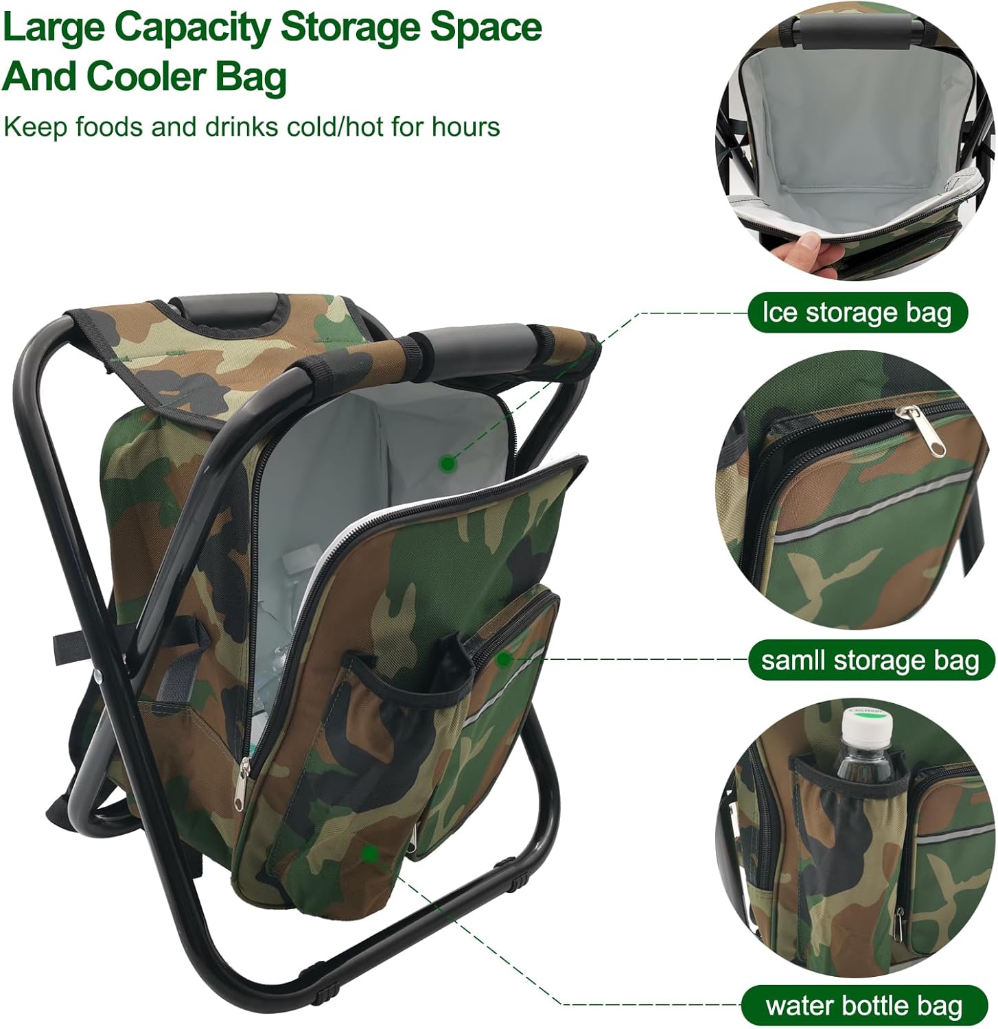 - Larger Storage Space: The folding backpack stool has larger storage convenient cooler bag. The inner waterproof insulation bag can provide 5-6 hours of temperature retention for food or beverages. The small zipper storage bag can be used to store keys, wallets, mobile phones and more.